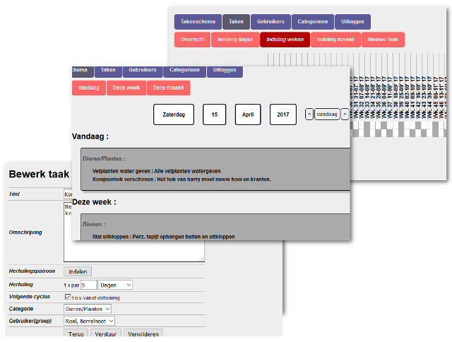 Takenschema.nl is bedoelt om eenvoudig terugkerende taken te beheren. Er zijn drie verschillende taken: - Taken die per x-aantal dagen uitgevoerd moeten worden - Taken die per x-aantal weken uitgevoerd moeten worden - Taken die per x-aantal maanden uitgevoerd moeten worden Invoer taken De taken kunnen ingevoerd worden met o.a. een titel, soort taak (per dag, week of maand), frequentie. E-mail en takenschema dagoverzicht Op de website kan in het dagoverzicht bekeken worden welke opdrachten er uitgevoerd moeten worden voor vandaag, deze week en deze maand. Als er nieuwe taken zijn die uitgevoerd moeten worden dan zal Takenschema.nl een mail sturen naar de betreffende gebruiker. |